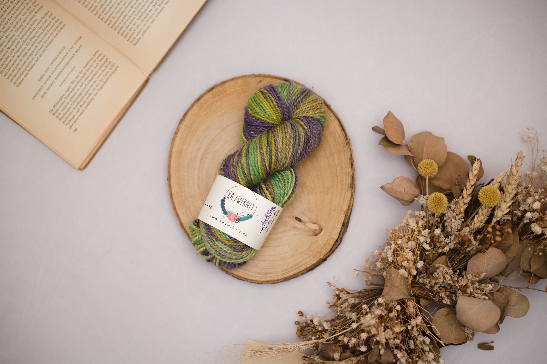 Ručně předená příze vzniká na mém kolovratu, za použití tradičních metod. Předu z vlny, kterou si sama barvím a díky použití různých metod dosahuji zajímavého míšení barev v každém přadenu.