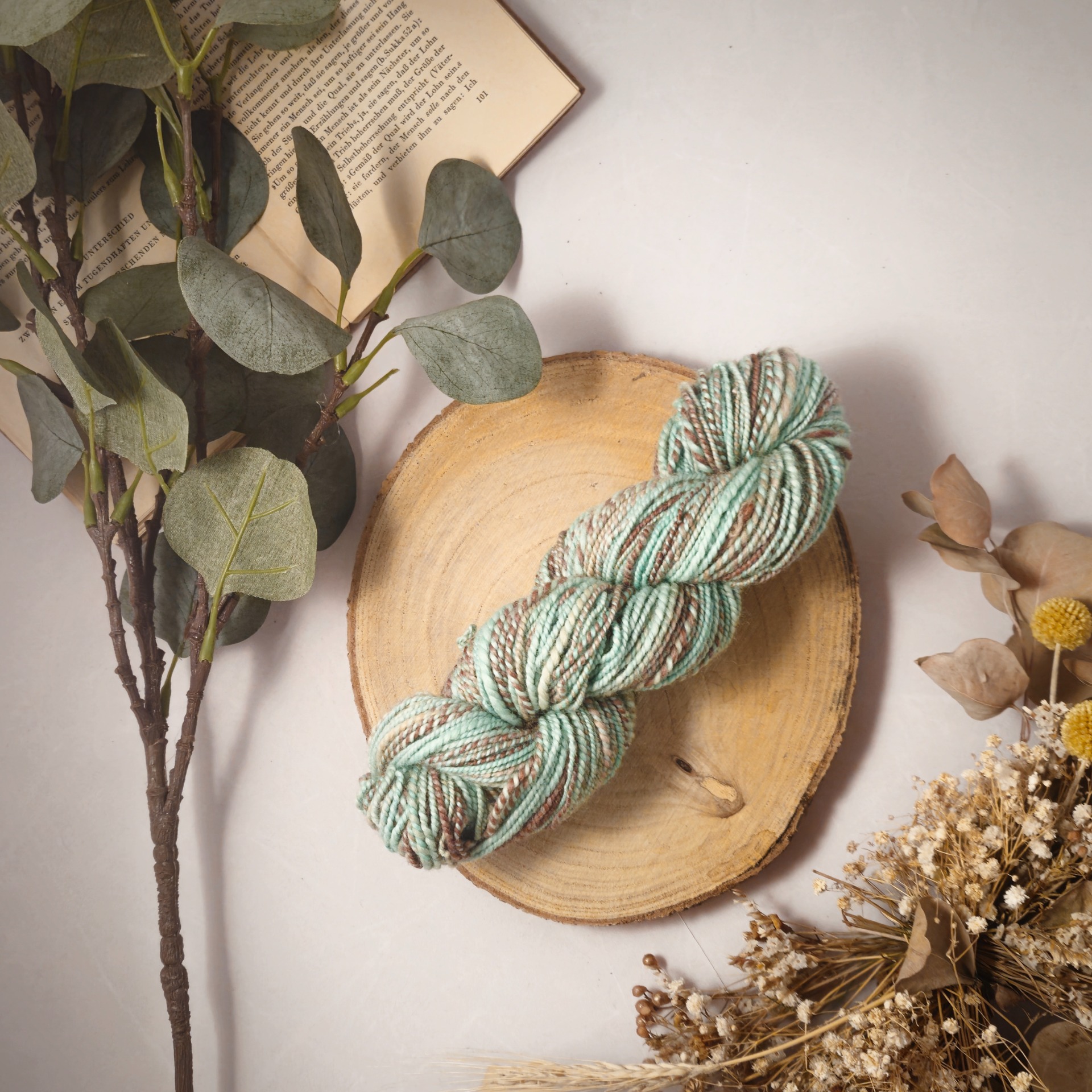Ručně předená příze vzniká na mém kolovratu, za použití tradičních metod. Předu z vlny, kterou si sama barvím a díky použití různých postupů dosahuji zajímavého míšení barev v každém přadenu.