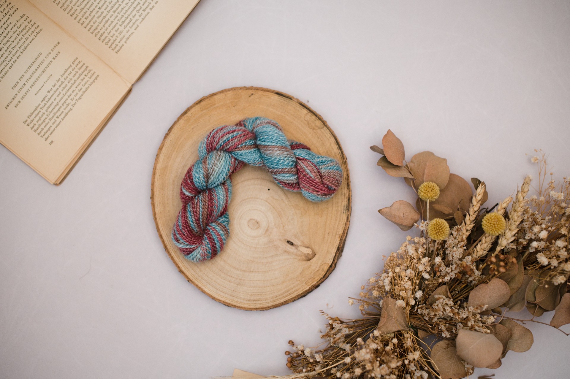 Ručně předená příze vzniká na mém kolovratu, za použití tradičních metod. Předu z vlny, kterou si sama barvím a díky použití různých metod dosahuji zajímavého míšení barev v každém přadenu.
